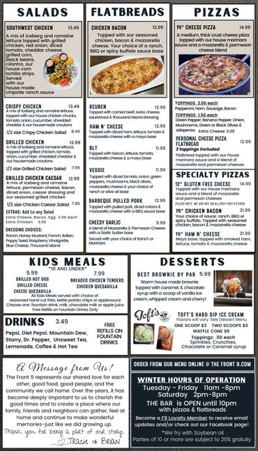 We (Brian & Tracie) proudly took ownership of the golf course & restaurant (formerly known as Nature Trails) at an auction in 2018. As a Family, we decided to purchase the Restaurant (clubhouse) and the Front 9 holes of the Golf Course after it had been vacant for almost 2 years. With a lot of hard work and determination, we opened our doors in July of 2019 as The Front Nine. Unfortunately, after being open for only 8 months the Covid epidemic came upon us. Those were the hardest months we endured when at times, we didn't know if we were going to make it. It definitely wasn't easy, but we made it through!!!